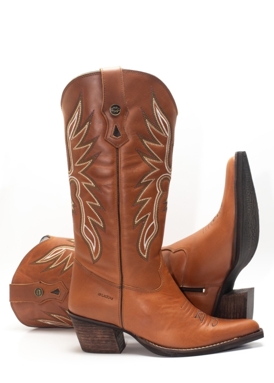 Bota Texana Feminina iATAi Cano Longo em Couro Caramelo e Bordado – Rustic Serenity