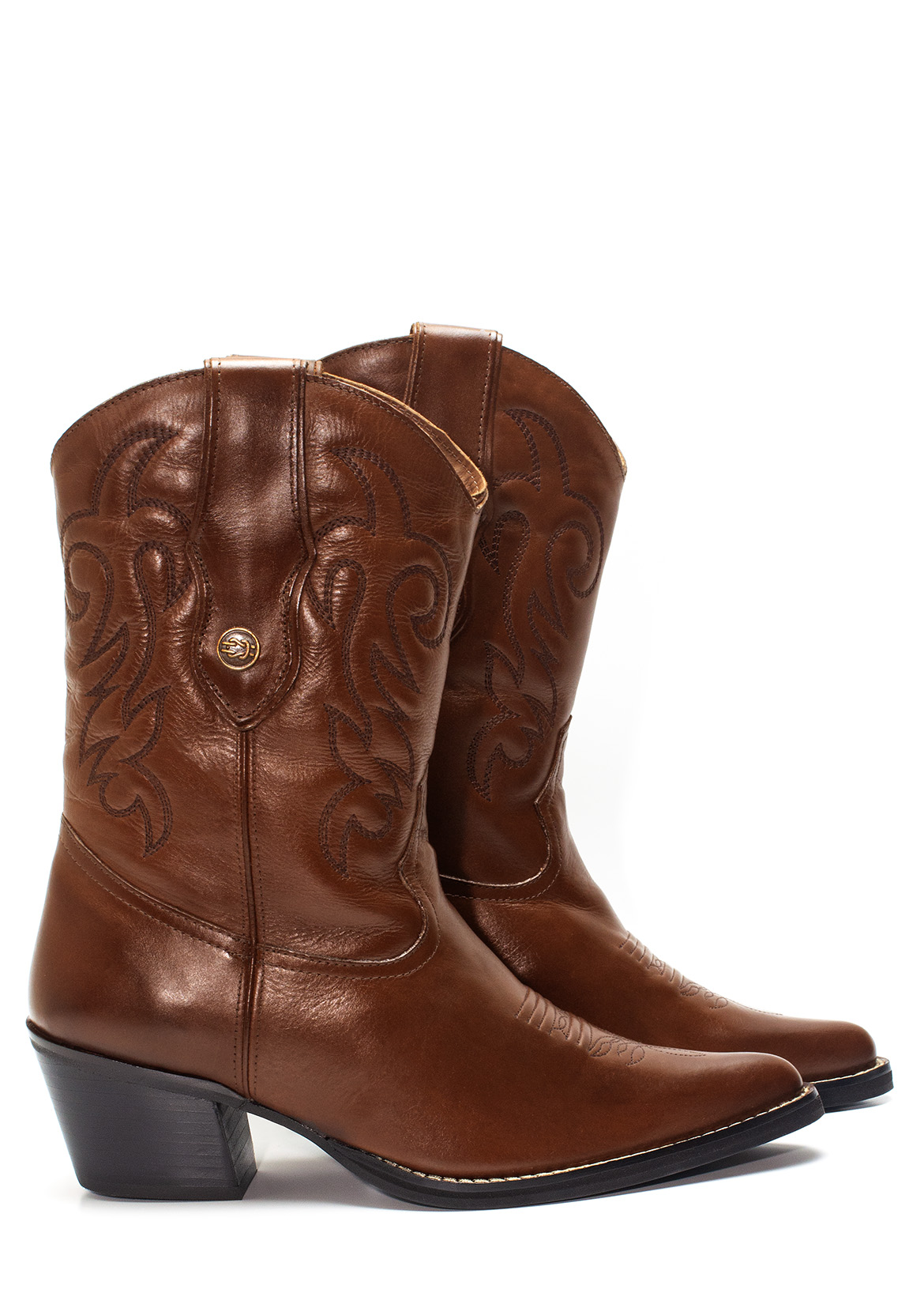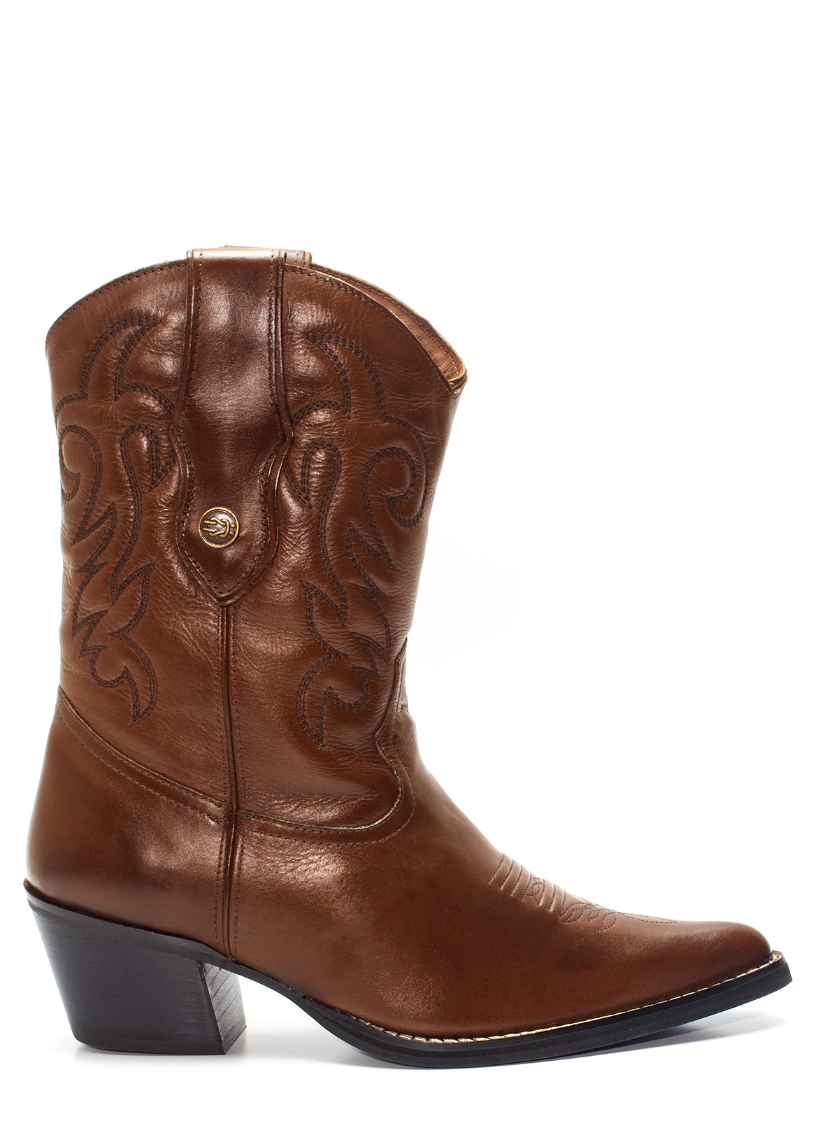 Bota Western Feminina iATAi Cano Curto em Couro na Cor Pinhão com Detalhes em Bordado – Wild West Wonder